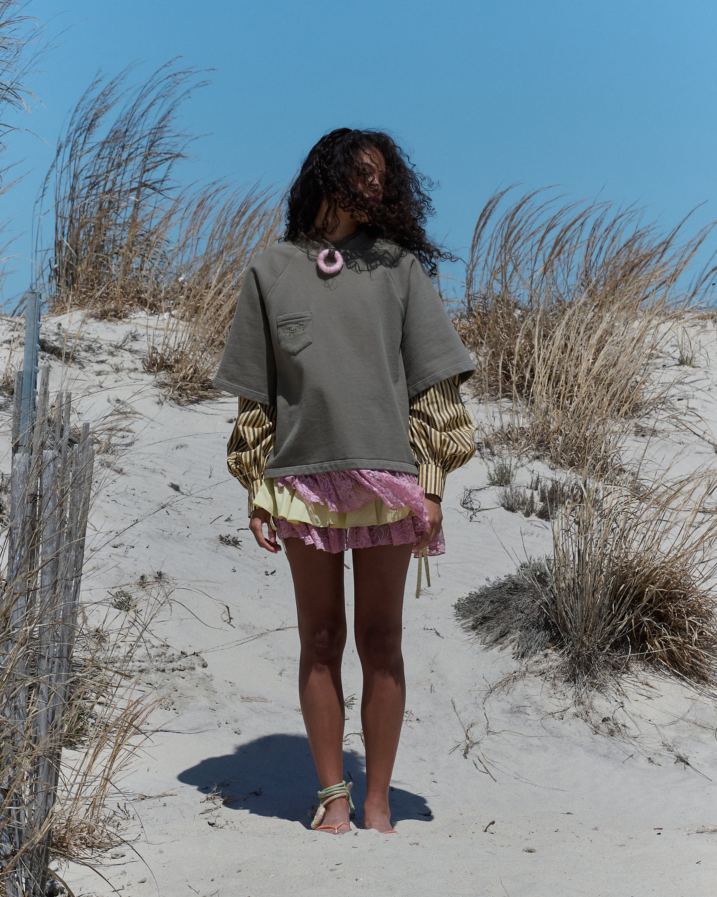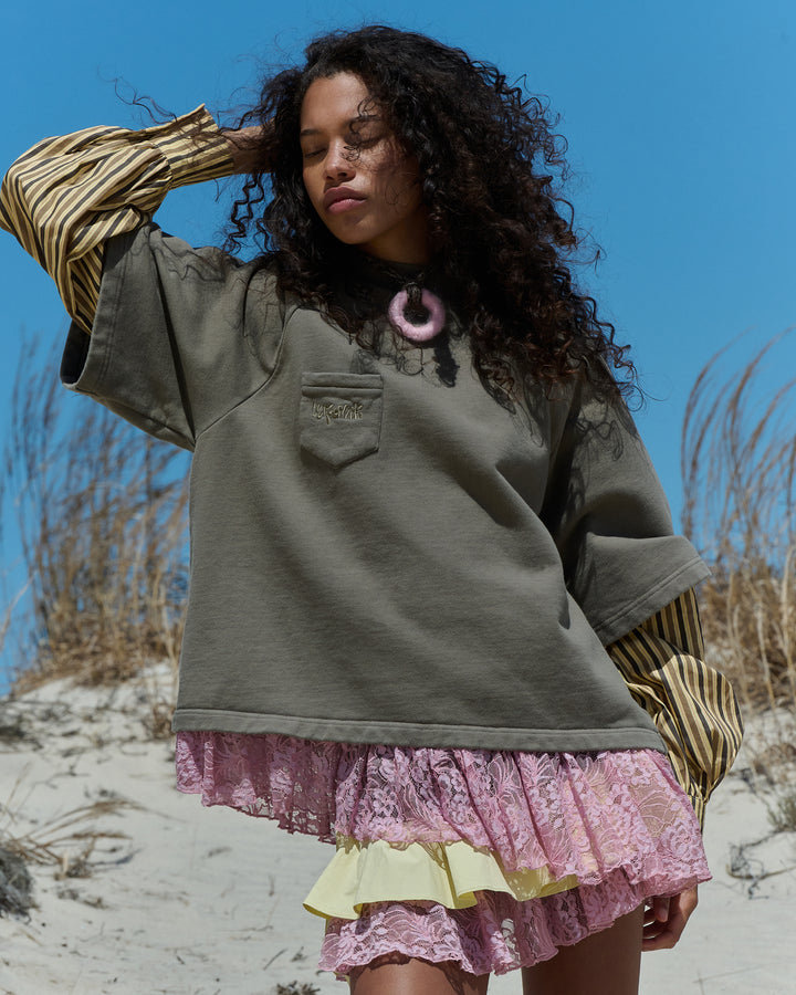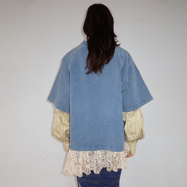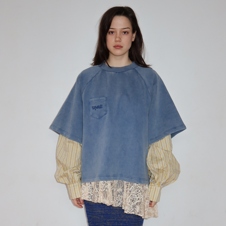 The perfectly layered tee with no effort needed. Made with the softest french terry, custom pinstripe sleeves, and an asymmetrical lace trim.