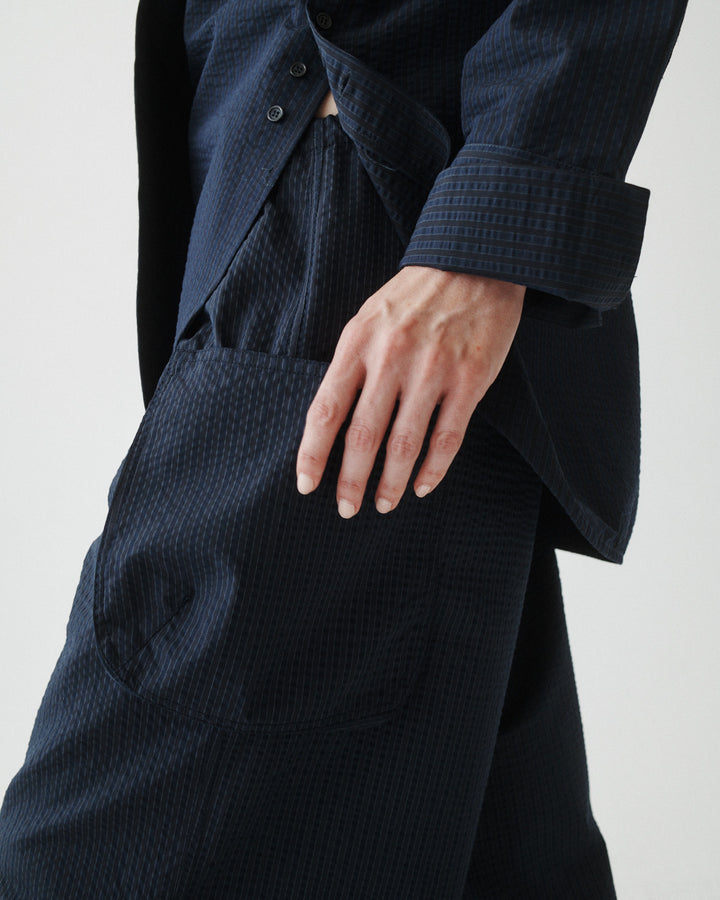 T.W.I.N.'s classic Cargo Pant in a seersucker stripe with a zipper fly, adjustable drawstrings at the waist and ankles, and darted knees for shape. Designed with two large cargo pockets and belt loops at the waistband for added utility. Worn low, mid or high rise, these pants are exactly what you need.